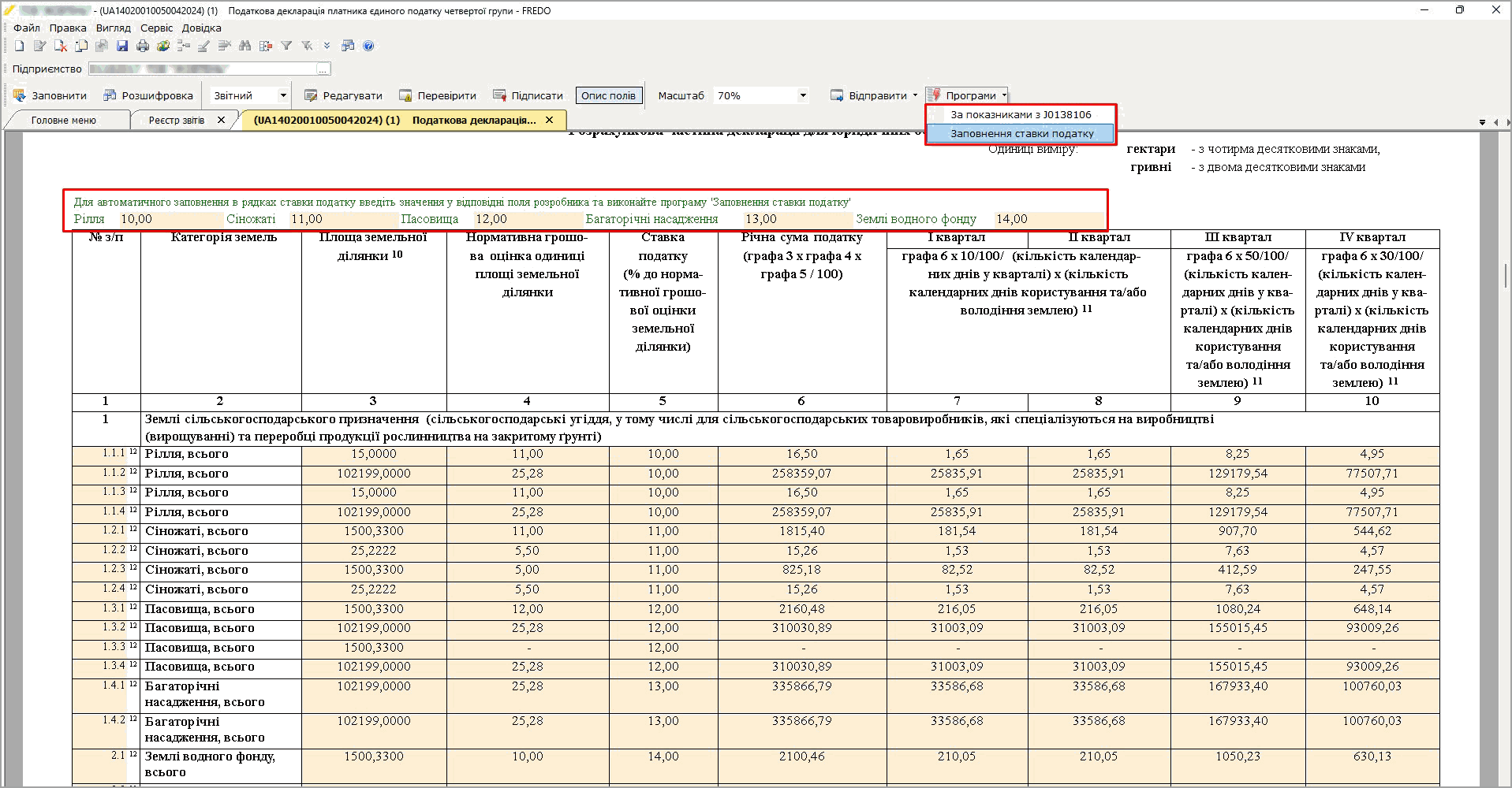 Автоматично заповняться графи 3 Площа земельної ділянки та графи 4 Нормативна грошова оцінка одиниці площі земельної ділянки з сумуванням площ земельних ділянок, для яких встановлені однакові значення системного поля Нормативна грошова оцінка за видами (категоріями) ділянок. Якщо у пакеті наявні декілька Додатків 1, показники площі виводяться у Декларацію окремо по кожному додатку. Щоб заповнити Ставку податку у кожному рядку наявних видів (категорій) ділянок, проставте ставки у полі розробника (зверху над таблицею, зелений текст) та виконайте Програми – Заповнення ставки податку. Ставки проставляються у кожному рядку, де наявна Площа земельної ділянки та автоматично буде розраховано Річну суму податку у графі 6 з розбиттям по кварталах у графах 7-10.  |