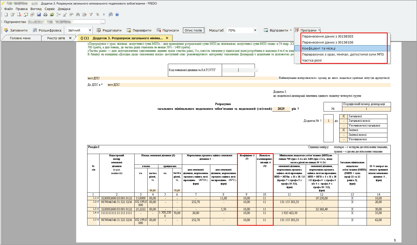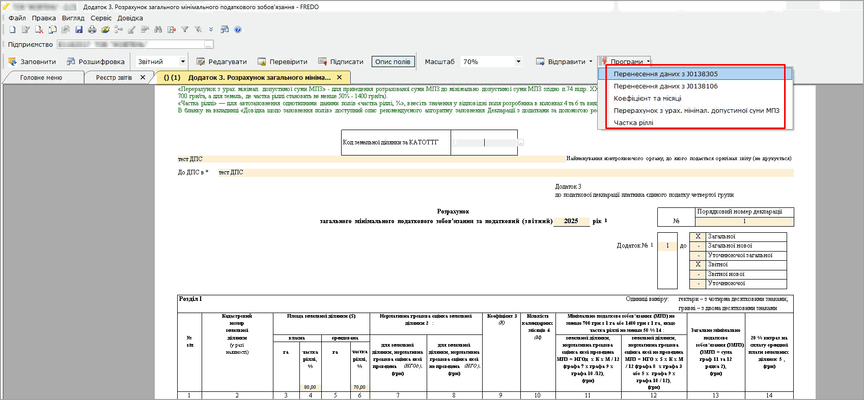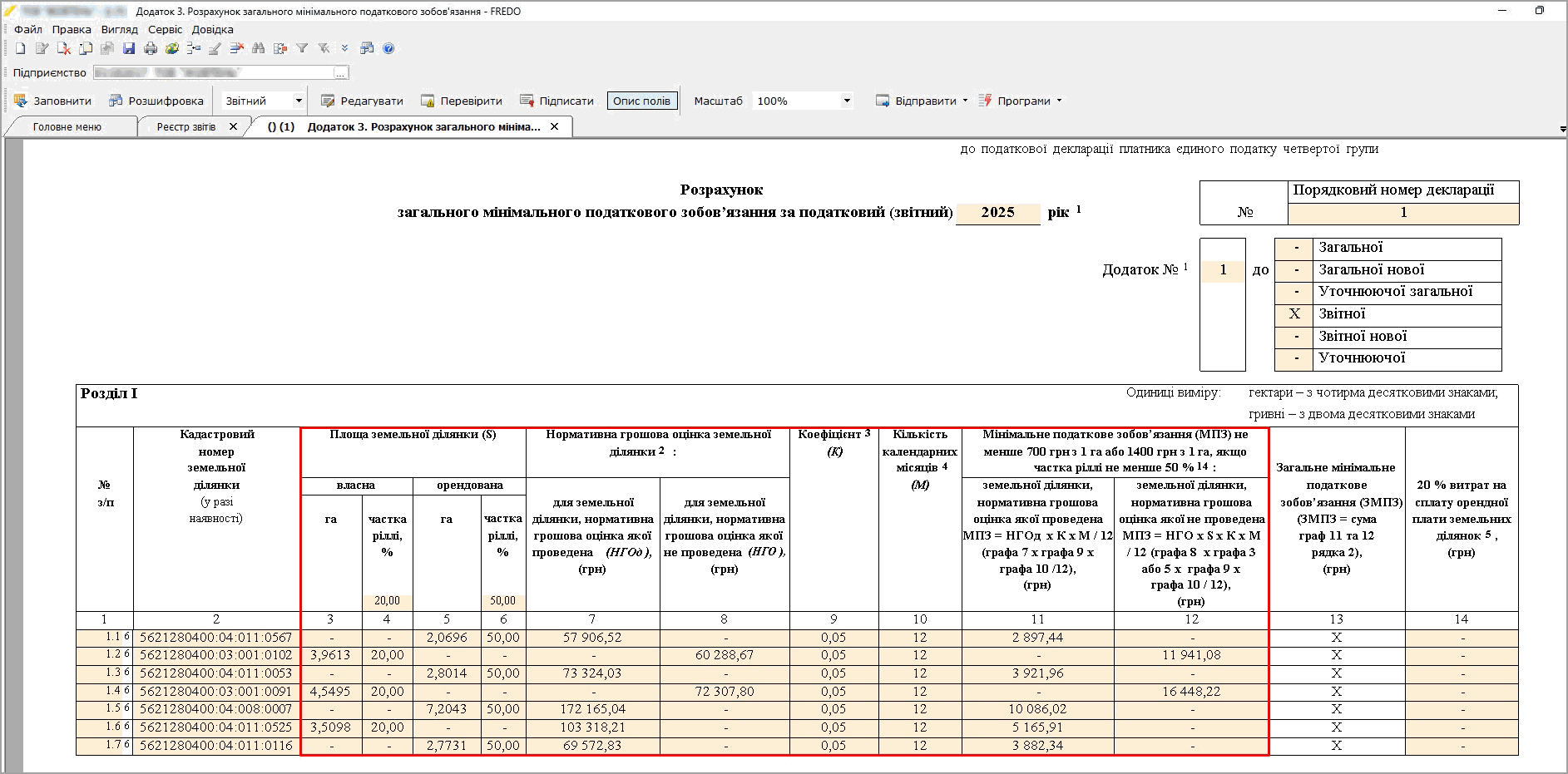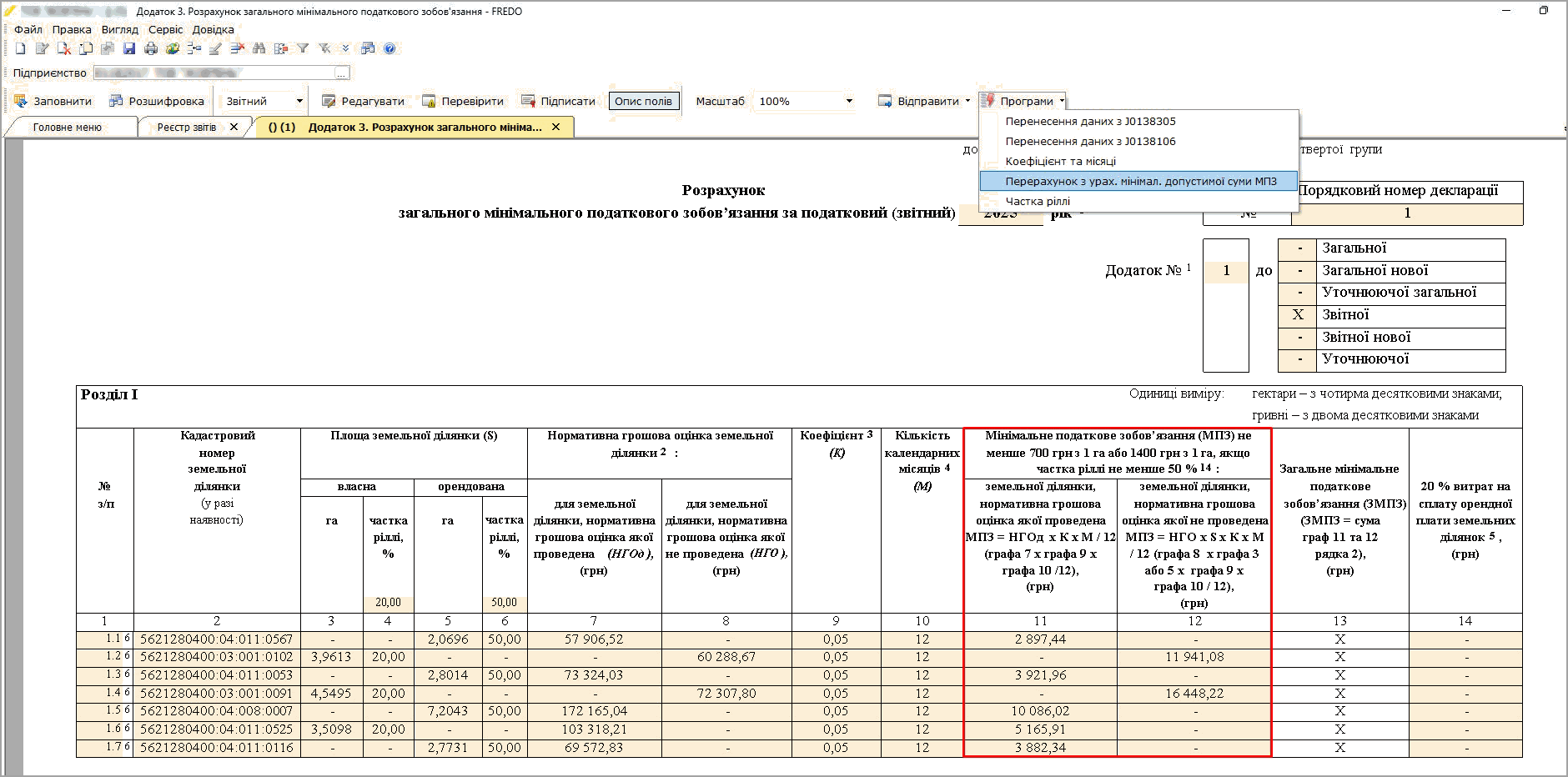 Після введення даних зг. пп.1-3 автоматично розрахується Мінімальне податкове зобов'язання (МПЗ) для ділянки, НГО якої проведена – графа 11, для ділянки, НГО якої не проведена – графа 12. Для приведення розрахованої суми МПЗ до мінімально допустимої суми МПЗ згідно до п.74 підр.10 розд. ХХ «Перехідні положення» ПКУ (Розмір МПЗ не може бути меншим за 700 грн/га, а для земель, де частка ріллі становить не менше 50% — 1400 грн/га) виконайте програму Перерахунок з урах. мінімал. допустимої суми МПЗ.