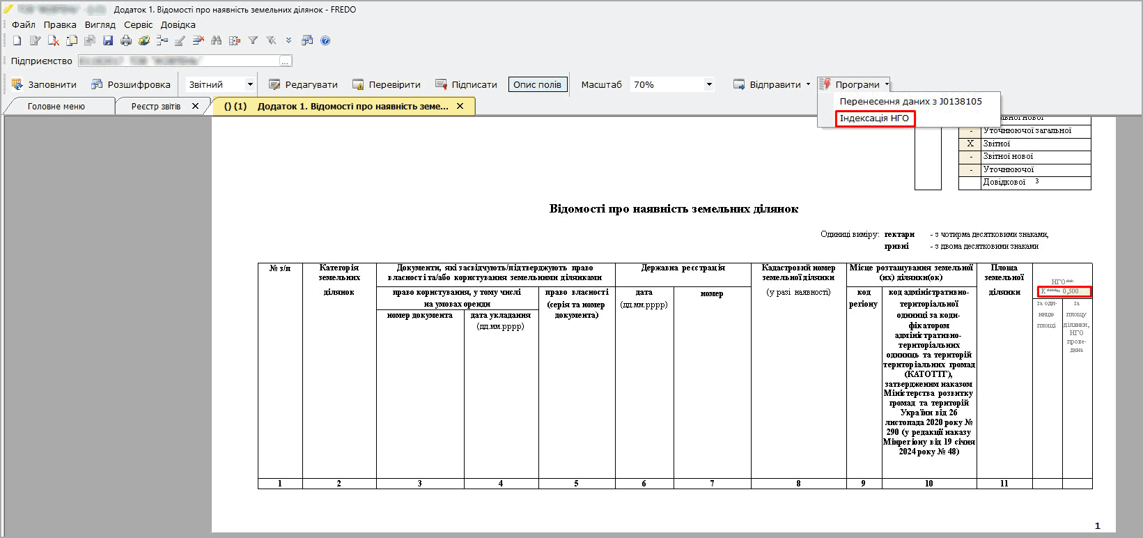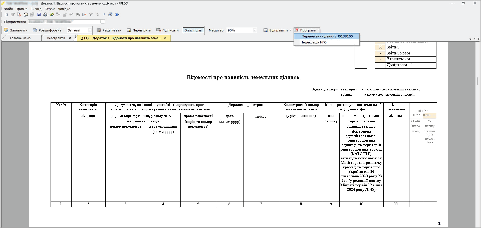1. Перенесення даних із попередньої версії бланка Додаток 3 містить програму користувача Перенесення даних з J0138305 для перенесення показників із попередньої версії (J0138305, F0138305). Переносяться дані наступних полів: Кадастровий номер земельної ділянки (ЗД), Площа ЗД власна та орендована, НГОд ЗД (проведена), НГО за 1 га ЗД (непроведена), Коефіцієнт, Кількість календарних місяців: