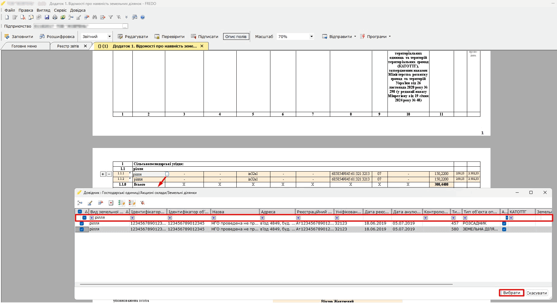 Перенести дані у звіт можна методом множинного вибору із довідника Господарські одиниці/Акцизні склади/Земельні ділянки.