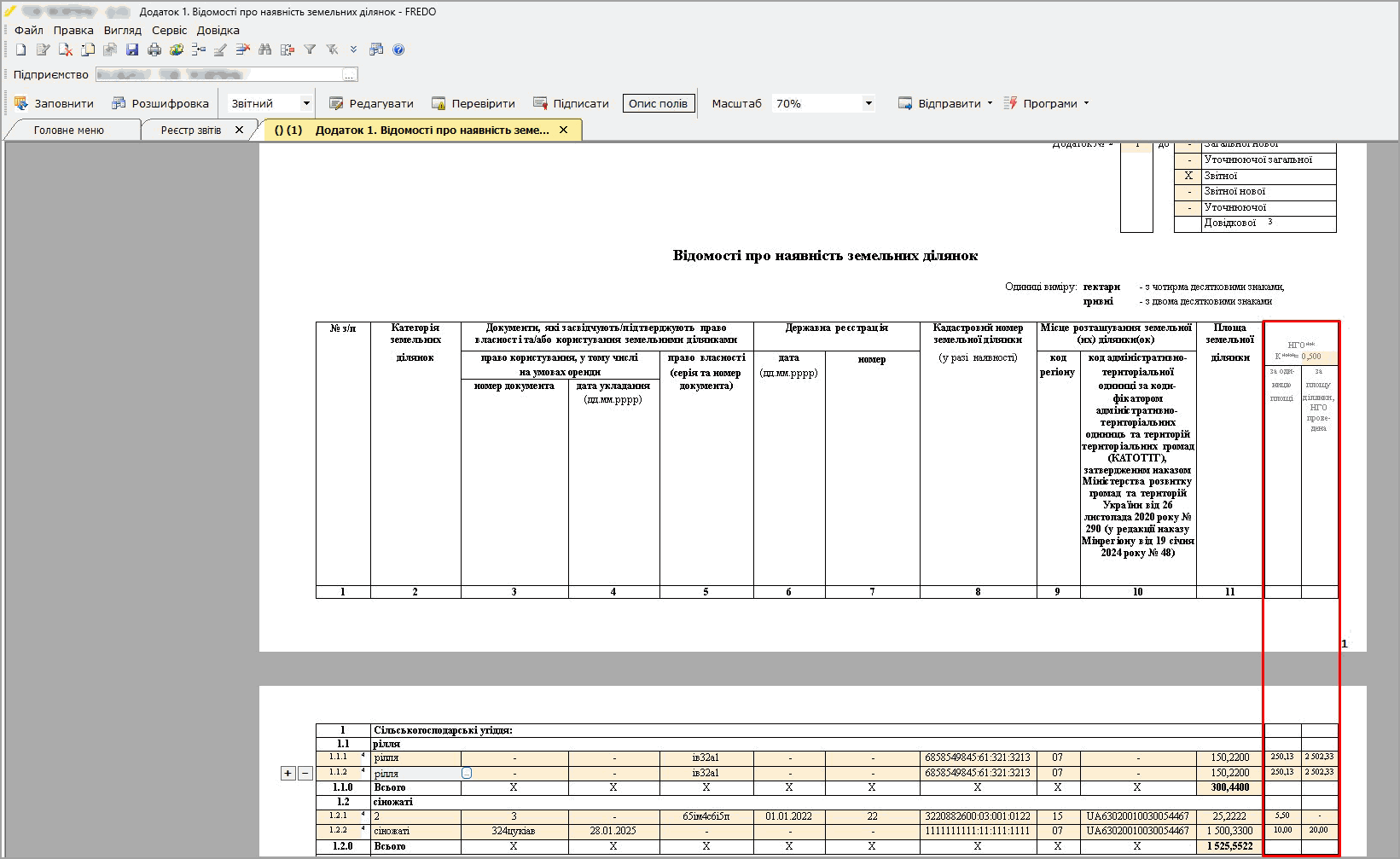 Після наповнення Додатка 1 даними з довідника Господарські одиниці/Акцизні склади/Земельні ділянки поля розробника: за площу ділянки, НГО проведена та за одиницю площі, НГО яких проведена чи не проведена, буде заповнено. Також будуть внесені показники у приховане поле - Частка ріллі. Дані цих полів далі будуть перенесені у Додаток 3.
