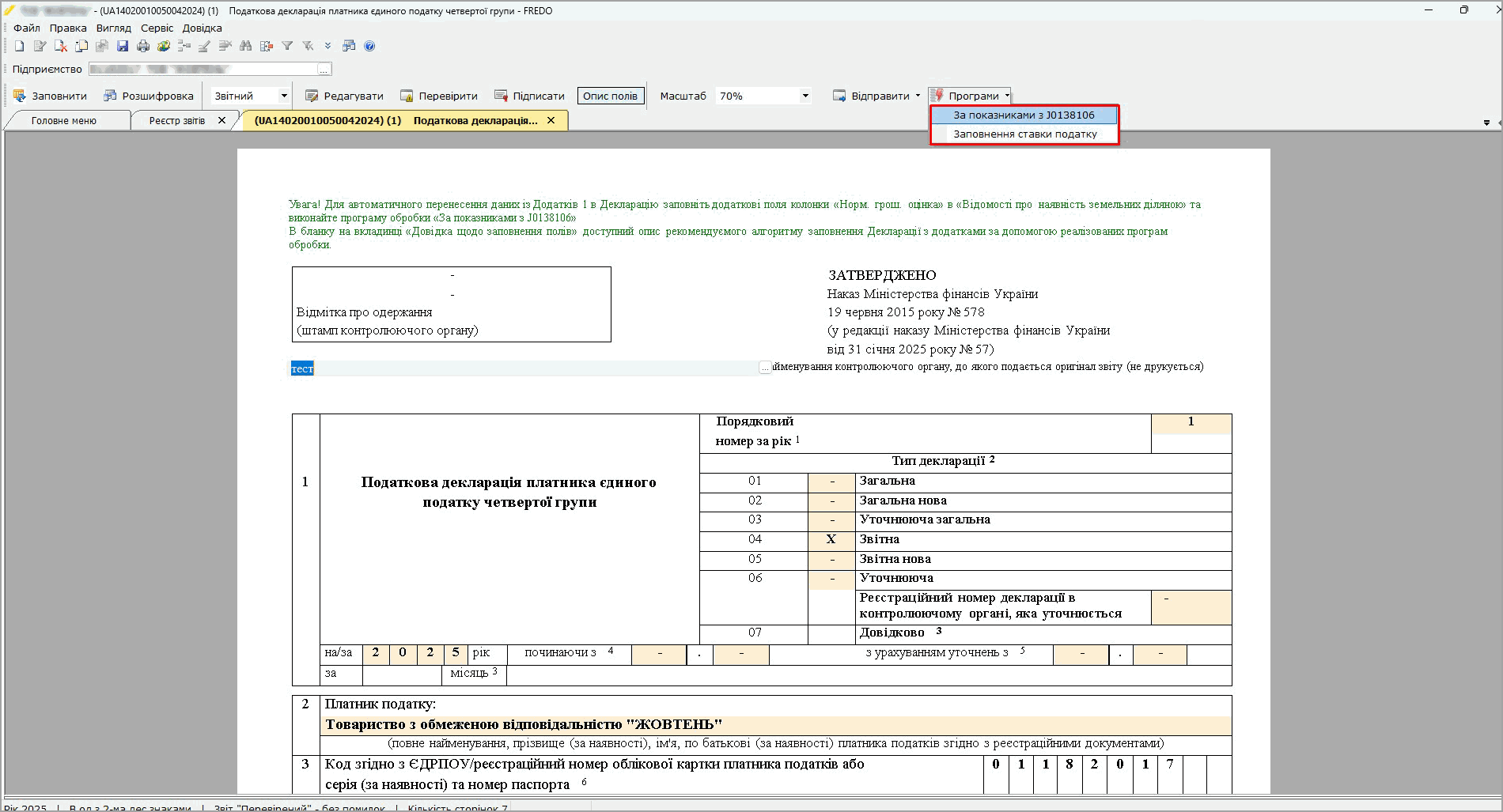 Заповнення Податкової декларації платника єдиного податку 4 групи (J0103806, F0103806) Після повного заповнення додатків для перенесення інформації про земельні ділянки з Додатків 1 до Декларації... виконайте програму За показниками з J0138106: